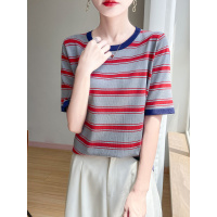 夏季新款海军风条纹圆领短袖女套头宽松显瘦棉线针织T恤衫