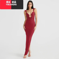 YIBUSHENGgusty欧美风圆环扣镂空低胸吊带过膝长裙性感辣妹露背开叉连衣裙
