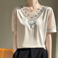V领蕾丝短袖T恤女夏薄宽松套头半袖打底体恤短款显瘦洋气缎面上衣_1