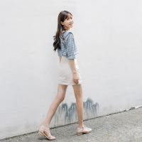 2017新款瞌睡兔甜美五分袖娃娃领格子衬衫女夏2017新款休闲显瘦百搭上衣
