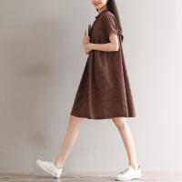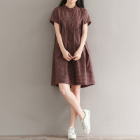 文艺复古木耳边休闲格子衬衫裙女夏宽松大码中长款短袖棉麻连衣裙