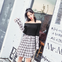 2017秋气质修身一字领露肩拼接针织长袖格子衬衫裙女连衣裙