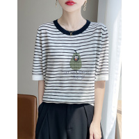 夏竹节麻韩系撞色圆领条纹卡通鸭梨减龄休闲舒适针织短袖女T恤
