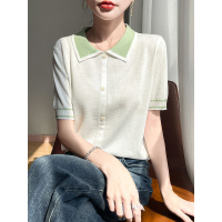 妈妈夏装短袖针织翻领T恤假开衫女装冰丝上衣遮肚子薄款小衫