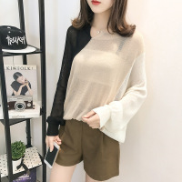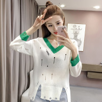 薇侣2017新品破洞V领拼色镂空休闲毛衣针织衫女长袖套头宽松薄防晒衫