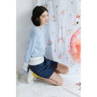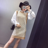 珂依舍2017秋装新款现货秋季新款韩版短款衬衣加镂空拼色针织毛衣两件套