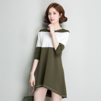针织拼色不规则镂空毛衣连衣裙女秋季新款韩版五分袖套头圆领