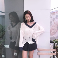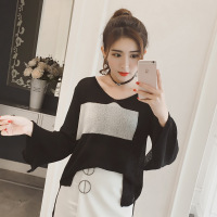 珂依舍2017秋装新款2017秋装新款气质时尚拼色镂空喇叭袖针织衫宽松显瘦上衣