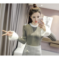 珂依舍2017秋装新款2017秋冬装新款韩版修身拼色套头毛衣女喇叭袖针织打底衫上衣