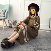 冬季加厚中长款过膝打底毛衣裙女韩版宽松圆领拼色套头打底连衣裙