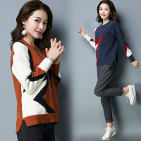 拼色圆领毛衣女套头短款2017新款韩版宽松拼接撞色针织打底衫秋冬