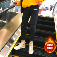 UYUK冬季破洞补丁学生休闲裤男加厚保暖港仔抽绳系带青少年修身潮男长裤子黑色