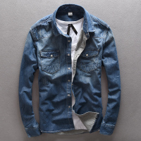 秋季纯棉牛仔衬衫男长袖帅气水洗磨白修身牛仔衬衣男日系复古休闲深蓝复古
