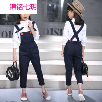 锦铭七玥韩版童装2018女童大童纯色背带裤花边领衬衫两件套 采源宝471