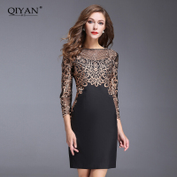 2017秋季新款女装ol网纱刺绣中裙七分袖气质修身显瘦优雅一步连衣裙