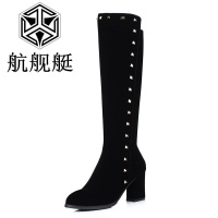 2017秋冬新款长靴子磨砂显瘦粗跟高筒靴尖头中高跟长筒及膝靴女鞋黑色