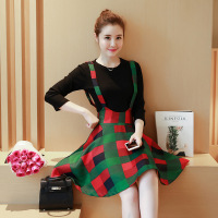 薇侣2017新品秋装女装两件套装裙时尚条纹T恤+背带裙韩版连衣裙半身短裙