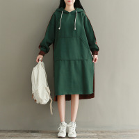 秋冬新款韩版宽松拼色加厚上衣女棉质抓绒套头连帽卫衣长款连衣裙