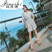 纪尼诗女装夏季2018新款韩版时尚连衣裤女气质翻领高腰条纹短袖阔腿短裤低胸夜店淑女潮职业