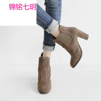 锦铭七玥新款韩版绒面女士方头高跟靴子春秋粗跟松紧带切尔西靴