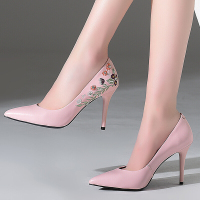 2018春季新款尖头超高跟细跟单鞋女真皮浅口女鞋时尚绣花朵气质酒杯跟职业OL小码鞋子