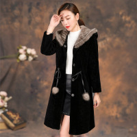 羊剪绒大衣女中长款水貂毛领皮草新款海宁羊羔毛外套连帽修身黑色