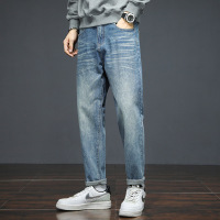 复古蓝宽松阔腿牛仔裤 男款水洗做旧裤 潮流卷边百搭休闲长裤