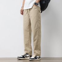 男士日系休闲裤 卡其色抽绳直筒裤 肌理感面料 小标装饰 透气长裤