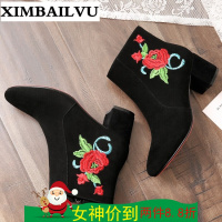 品牌粗跟花朵真皮女靴2017新款秋冬英伦高跟靴子低筒靴方头大码马丁靴子ZD392