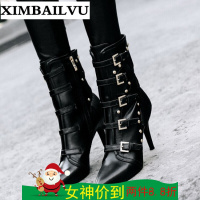 品牌秋冬新款女士欧美尖头皮带扣马丁靴骑士机车靴纯色头层牛皮短靴细高跟低筒靴休闲女靴黑色