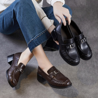 复古风乐福鞋女2026春季新款褶皱粗跟英伦风小皮鞋羊皮中跟单鞋子