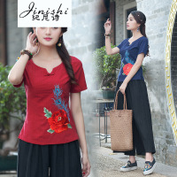 纪尼诗女装2018年新款民族风短袖绣花麻T恤领口小V显瘦上衣女