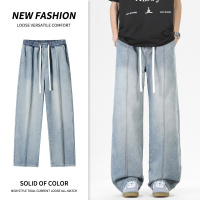 YANXU春季青少年复古做旧抽绳牛仔裤男bf宽松直筒阔腿港风百搭拖地长裤