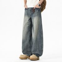 高街做旧牛仔裤男 2026 新款皮牌装饰复古蓝调宽松阔腿拖地长裤子
