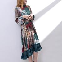 半高领碎花雪纺连衣裙 仙女中长裙子 度假沙滩裙复古a字百褶裙潮