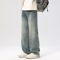 YANXU复古做旧牛仔裤男秋季潮牌宽松水洗黄泥染直筒裤休闲百搭阔腿长裤