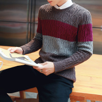 新款男套头圆领羊绒衫时尚拼色彩条针织衫横条纹加厚毛衣男