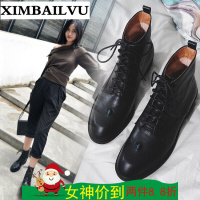 品牌真皮短靴女粗跟尖头踝靴中跟系带马丁靴2017秋冬新款