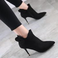 韩版秋冬新款蝴蝶结细跟尖头女靴高跟鞋裸靴踝靴拉链绒面短靴女鞋