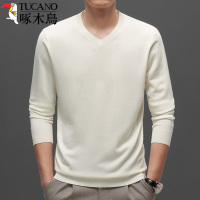 啄木鸟春季新款桑蚕丝打底针织衫纯白色羊毛V领套头内搭薄毛衣男