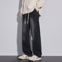 潮牌抽绳牛仔裤男士黑灰水洗阔腿裤高街复古休闲长裤工厂直供