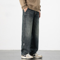 复古做旧水洗牛仔裤男士宽松直筒阔腿裤高街潮牌休闲牛仔长裤男