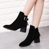 2017秋冬新款短靴女皮带扣尖头女靴粗跟流苏马丁靴女侧拉链女短靴