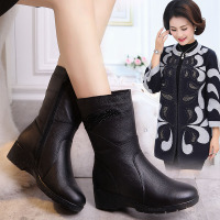 秋冬新款真皮中筒靴妈妈鞋女靴坡跟中靴加绒保暖粗跟女士皮靴靴子