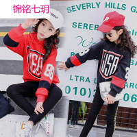 锦铭七玥儿童装女童2018春款韩版中大童运动套装休闲装女款连帽卫衣两件套