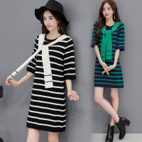 莞馨(wanxin)新款条纹简约时尚百搭2016年秋季H型五分袖圆领潮流气质连衣裙女