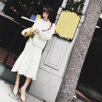 复古连衣裙针织两件套新款修身显瘦微喇叭裙摆女羊毛套装裙白色