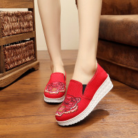 2017新款老北京女布鞋坡跟绣花鞋民族风红色高跟单鞋内增高舞蹈汉服鞋婚鞋