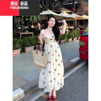 YIBUSHENG遇见家大码法式方领泡泡袖连衣裙女胖mm樱桃刺绣温柔风海边度假裙