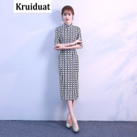 奈琴尔2017新款双层人字纹中长款旗袍连衣裙日常中袖复古修身旗袍短款